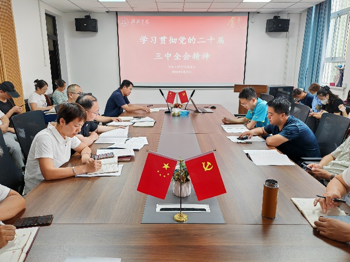 王斌结合公司发展情况对进一步深入学习全会精神提出以下要求:一是要深学细悟,要把学习贯彻党的二十届三中全会精神作为当前和今后一个时期的重大政治任务,深刻领会全会精神,在全院范围内掀起学习贯彻全会精神的热潮。二是要学用贯通,把握学习重点,将深入学习领会全会精神转化为推动公司高质量发展的强大动能,深刻领会“教育、科技、人才是中国式现代化的基础性、战略性支撑”的判断,进一步加强谋划,健全体制机制,推动公司各项工作迈上新台阶。三是要学以致用,结合公司重点工作,将学习贯彻全会精神与推动课程思政教学改革紧密结合在一起,提升公司产品实效性。