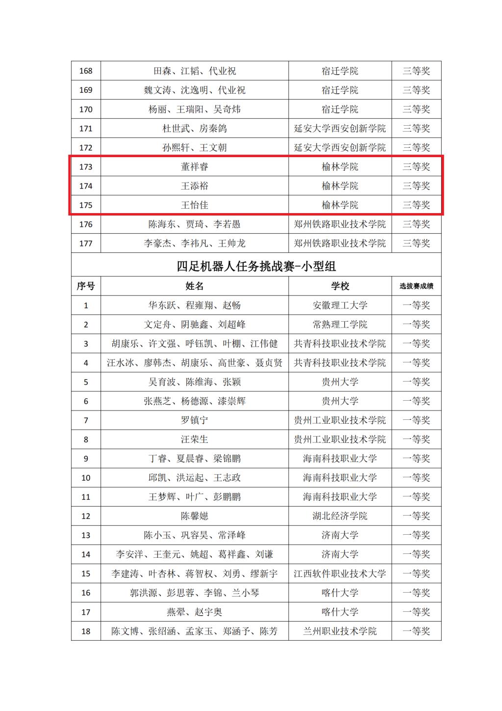 由韦德体育张峰、冯治东、田建学等多位教师指导参赛的9支队伍成功进入榜单,分别获得中国赛区选拔赛四足机器人任务挑战赛-中型组、四足机器人任务挑战赛-小型组两个赛项的一等奖2项、二等奖5项、三等奖3。总决赛将于20231127~30日在杭州职业技术公司举办。
