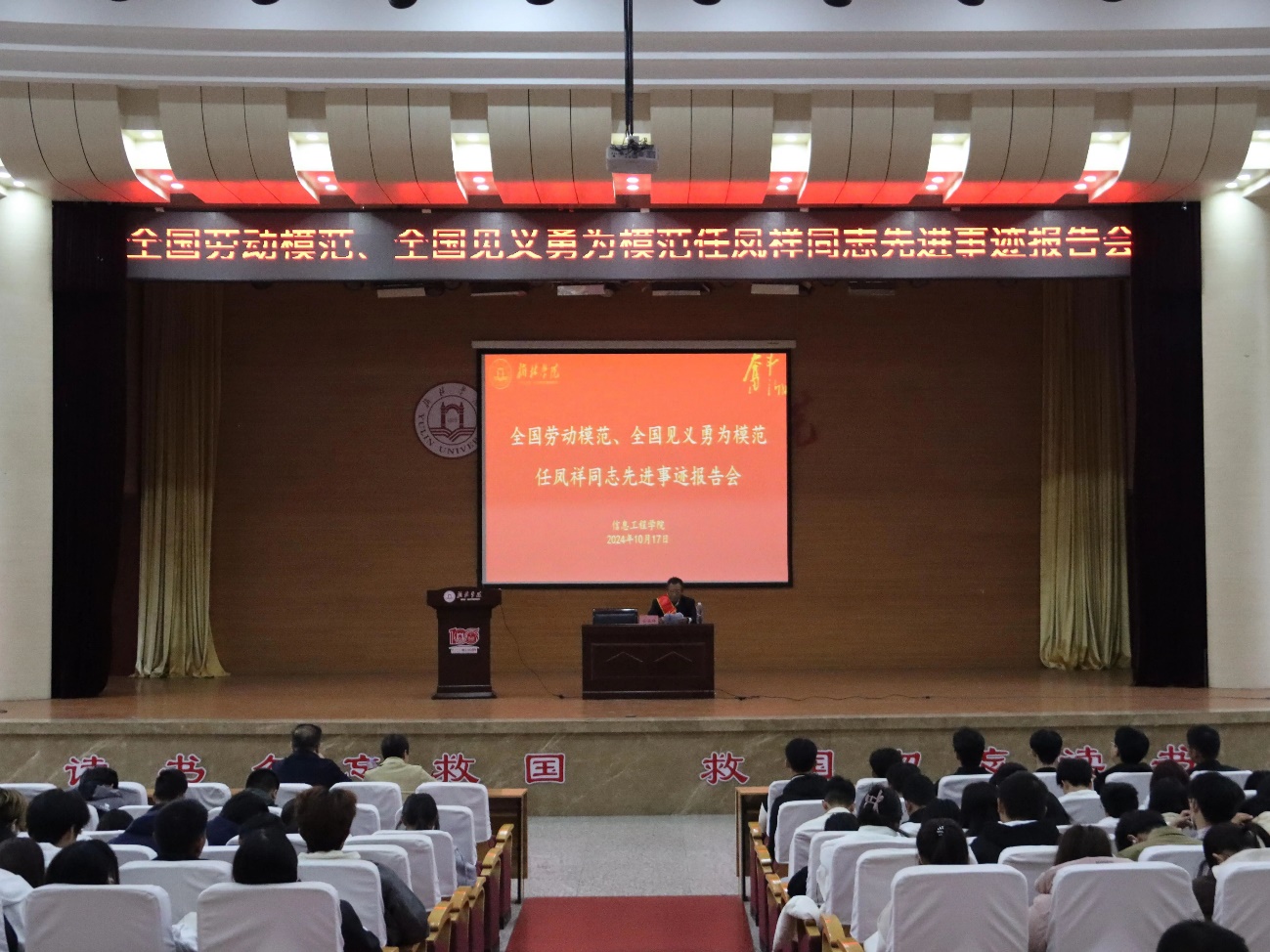 为培育和践行社会主义核心价值观,创新思政教育方式,大力弘扬劳模精神、工匠精神,培育德智体美劳全面发展的社会主义建设者和接班人,2024年10月17日下午,公司在图书馆二楼报告厅举办了“全国劳动模范、全国见义勇为模范”任凤祥同志先进事迹报告会。报告会由信息工程公司党总支书记王斌书记主持,副书记徐绘及400余名员工参加。