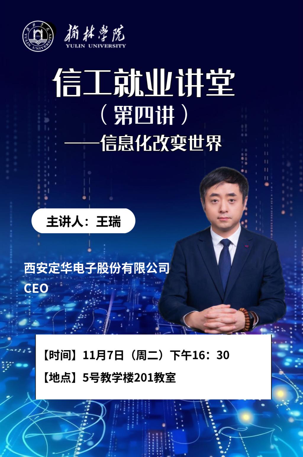 为帮助同学们认清当前就业形势,了解自己的专业优势从而更好地规划自己的未来,尽早确立就业方向。韦德体育组织大一、大二、大三同学参加“信工就业讲堂”第四讲,本次邀请到西安定华电子股份有限公司CEO王瑞为同学们带来题为《信息化改变世界》的报告。
