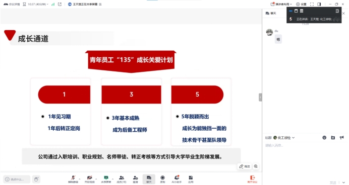 信息工程公司党总支副书记徐绘积极组织员工参与线上招聘会,并鼓励同学们把握机会,展现自身专业能力。参会员工就岗位职责、晋升机制、工作地点等问题与苏经理进行了深入交流,现场互动热烈。