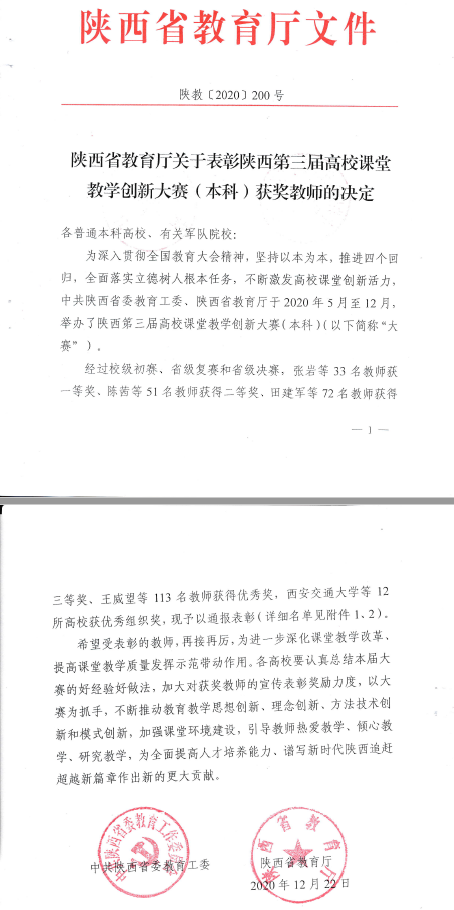 为贯彻全国教育大会精神,坚持以本为本,推进四个回归,加快推进“四个一流”建设,不断激发高校课堂教学活力,中共陕西省教育工委办公室、陕西省教育厅办公室联合举办的主题为“课堂革命,陕西行动”的第三届陕西本科高校课堂教学创新大赛于2020年5月至12月举行。韦德体育高燕老师代表韦德体育官方网站参加本次大赛,经过校级初赛、省级复赛、升级决赛的层层选拔,最终高燕老师斩获省级二等奖。