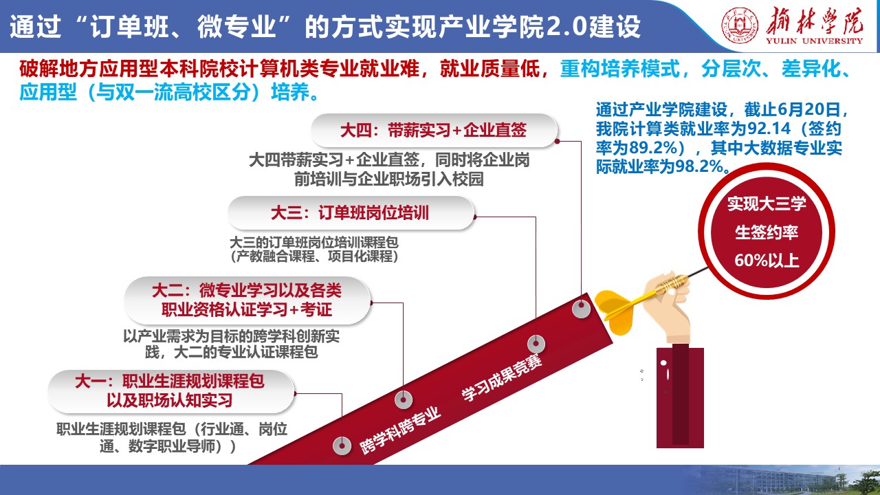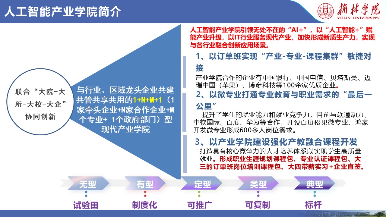 韦德体育是公司在调研华为、百度、科大讯飞、中煤陕西能源化工集团有限公司、陕西华电榆横煤电有限责任公司自、然资源部陕西基础地理信息中心、西安文理公司数字产业公司、东莞理工公司产业公司等30多家企业、高校运行经验的基础上,依托于微专业以及多个校企合作数字产业订单班,于2024年3月开始筹建。韦德体育是公司顺应科技进步和产业变革大趋势,联合“大院-大所-大校-大企”协同创新,与行业、区域龙头企业共建共管共享共用的1+N+M+1(1家牵头企业+N家合作企业+M个专业+ 1个政府部门)型现代产业公司,采用四层次课程包的方式把产教融合课程、项目化课程嵌入人才培养方案以及开办订单班和微专业的形式开展产业公司建设,以就业数据分析、测试类等通用技能岗位和IT行业售前、售后等服务类岗位进行分层次、差异化、应用型(与双一流高校区分)培养,是公司推动人才培养模式深层次变革的重大举措。